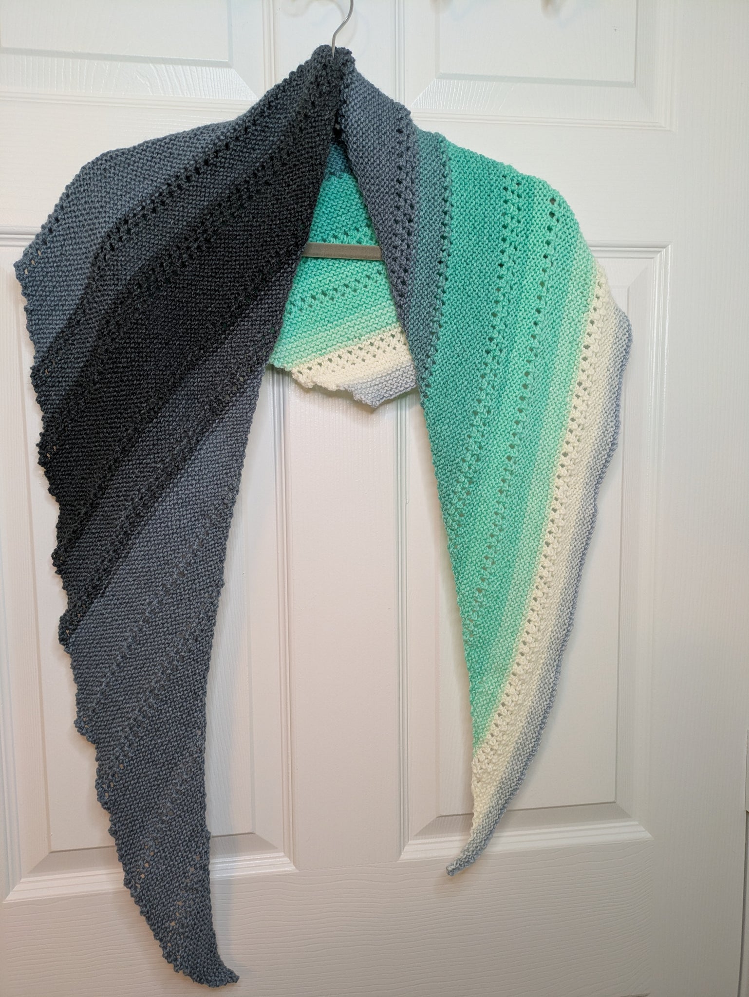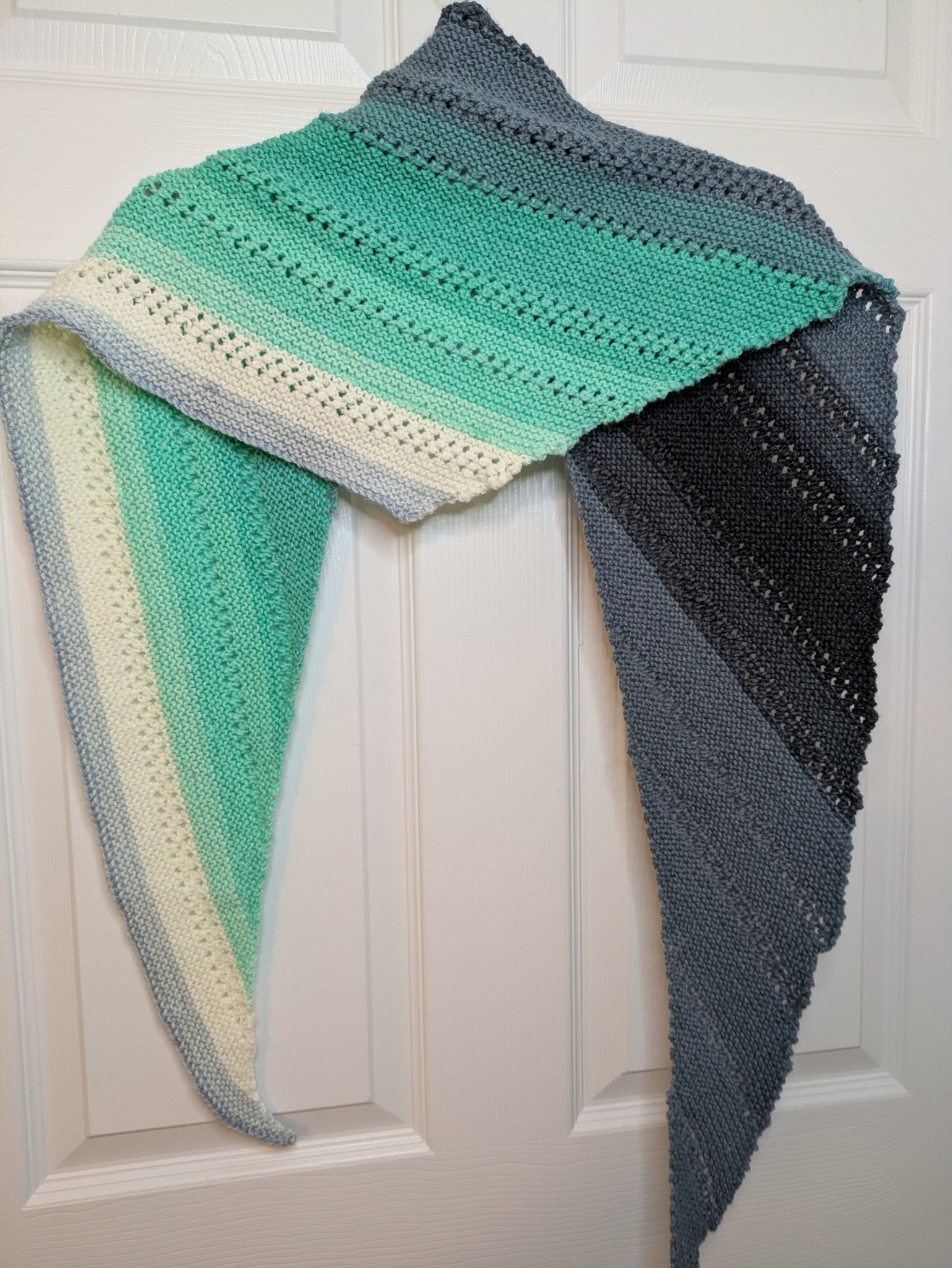 Create your own style with the Mandala Shawl, measuring 70" long x 15" wide. The colorway gradually fades from dark to light gray, then to refreshing mint green and crisp white. Alternating solid and lacy insets create a delicate texture that adds a classic touch to any outfit. Perfect as an accent accessory, it elevates your look while offering lightweight warmth and style.